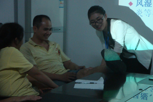 陳老師還現(xiàn)場(chǎng)向員工們傳授了穴位保健相關(guān)基礎(chǔ)知識(shí)和有效的預(yù)防及改善方法。通過(guò)真人模擬的方式,用電療儀等輔助治療器械幫助員工了解疏通穴位、測(cè)量血壓的操作方法。