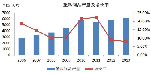 2013年我國(guó)塑料制品產(chǎn)量6,188.66萬(wàn)噸,同比增長(zhǎng)8.02%;截至2014年12月,塑料制品規(guī)模以上企業(yè)14,062個(gè);完成主營(yíng)業(yè)務(wù)收入20,392.39億元,同比增長(zhǎng)8.92%;利潤(rùn)總額1,182.86億元,同比增長(zhǎng)4.24%;實(shí)現(xiàn)出口交貨值2,260.66億元,同比增加了2.82%。由此可見(jiàn),塑料制品行業(yè)在我國(guó)的產(chǎn)業(yè)規(guī)模在不斷擴(kuò)大,其產(chǎn)量也逐年提高,同比增長(zhǎng)率近兩年有所放緩。