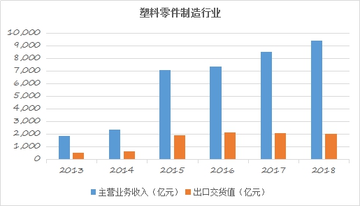 其中塑料零件制造業(yè)的主營(yíng)業(yè)務(wù)收入及出口交貨值在近5年內(nèi)呈現(xiàn)上升趨勢(shì),2010年至2011年間增長(zhǎng)尤為迅速,主營(yíng)業(yè)務(wù)收入從2,372.82億元增長(zhǎng)近200%至7,095.59億元,出口交貨值從635.79億元增長(zhǎng)至1,914.26億元;2012年至2014年間增速雖有所放緩,但主營(yíng)業(yè)務(wù)收入仍在擴(kuò)大,截至2014年已達(dá)到9,394.13億元。