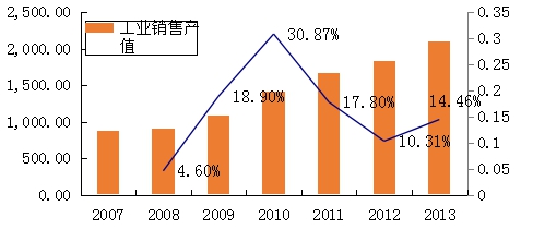 我國(guó)模具行業(yè)盡管起步較早,但初期一直作為下游生產(chǎn)企業(yè)的附屬企業(yè),模具商品流通率較低,限制了模具企業(yè)的發(fā)展。直至1987年, 模具才作為產(chǎn)品被列入機(jī)電產(chǎn)品目錄, 當(dāng)時(shí)全國(guó)共有生產(chǎn)模具的廠點(diǎn)約6,000家, 總產(chǎn)值約30億元。經(jīng)過(guò)20多年的發(fā)展, 中國(guó)的模具工業(yè)已有了長(zhǎng)足的進(jìn)步,截至2013年,企業(yè)數(shù)量達(dá)3萬(wàn)家,年產(chǎn)值達(dá)2,200億元人民幣,年出口接近50億美元。目前,我國(guó)模具行業(yè)的最大市場(chǎng)是汽車(chē)行業(yè)、電子信息行業(yè)、家電和辦公設(shè)備、機(jī)械和建材行業(yè)。隨著我國(guó)國(guó)民經(jīng)濟(jì)的迅速發(fā)展,人民收入水平的提高,對(duì)汽車(chē)、電子消費(fèi)產(chǎn)品、家電等的需求不斷增加,使得這些行業(yè)近年來(lái)進(jìn)入一個(gè)高速發(fā)展的階段,成為我國(guó)模具行業(yè)迅速發(fā)展的一個(gè)重要原因。下圖為2007-2013年我國(guó)模具產(chǎn)值圖,可以看到,近年來(lái)我國(guó)模具行業(yè)產(chǎn)值增長(zhǎng)迅速,已經(jīng)從2007年的870億元增長(zhǎng)到2013年的2,106億元,增長(zhǎng)率遠(yuǎn)高于世界模具行業(yè)整體水平。