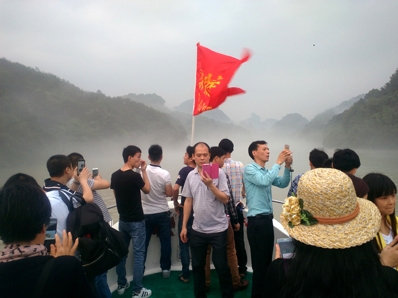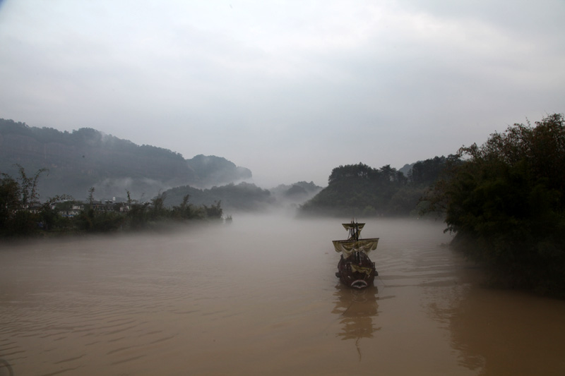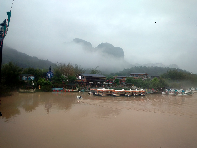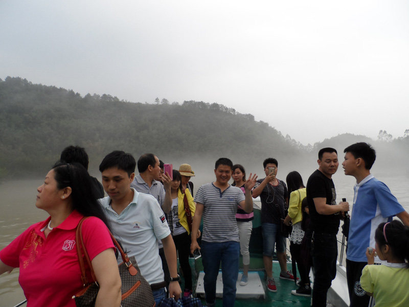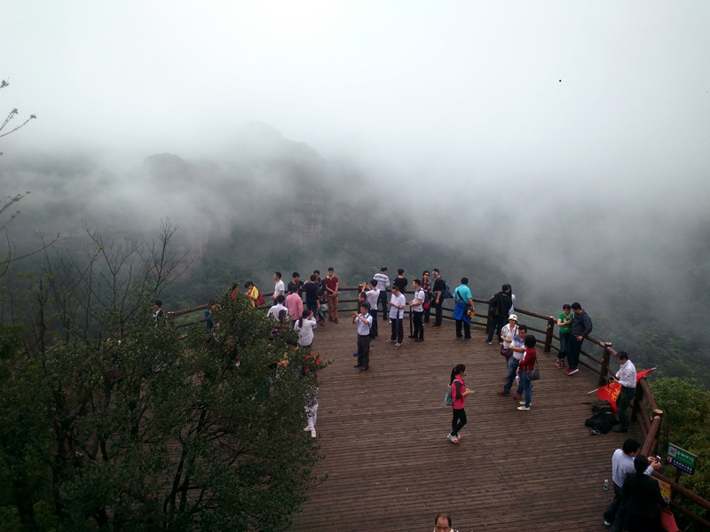 剛到丹霞山附近,就下起了瓢潑大雨,好像是老天有意要讓我們這些遠道而來的游客先歇歇腳。沒辦法,只好在用過午餐后到預先訂好的旅館內休息。約莫過了1小時,雨終于停住了,團隊終于可以出發(fā)了。我們步行來到景區(qū)門口,照張集體照顯然是很有必要的。在導游的帶領下,團隊一行漫步來到了第二站:丹霞山的標志性景區(qū)陽元山。一路游客并不多,主要聚集在拍攝區(qū)拍攝陽元石,然后原路返回。第三站:水上丹霞乘坐游船游錦江。人們常說“桂林山水甲天下,陽朔山水甲桂林”,我認為錦江山水完全可以與漓江相媲美。我們登上游船,在船長的講解下,充分發(fā)揮大家的想象力,一路可以看到睡美人、群象出山,六指琴魔、拇指山、龜頭山、啤酒瓶山等自然景觀,每一景點無不形神相似。江兩岸的綠樹、紅巖、霧海、寺廟以及河流構成了如夢如幻的人間仙境,真有種“舟行碧波上,人在畫中游”的感覺,充滿了詩情畫意。